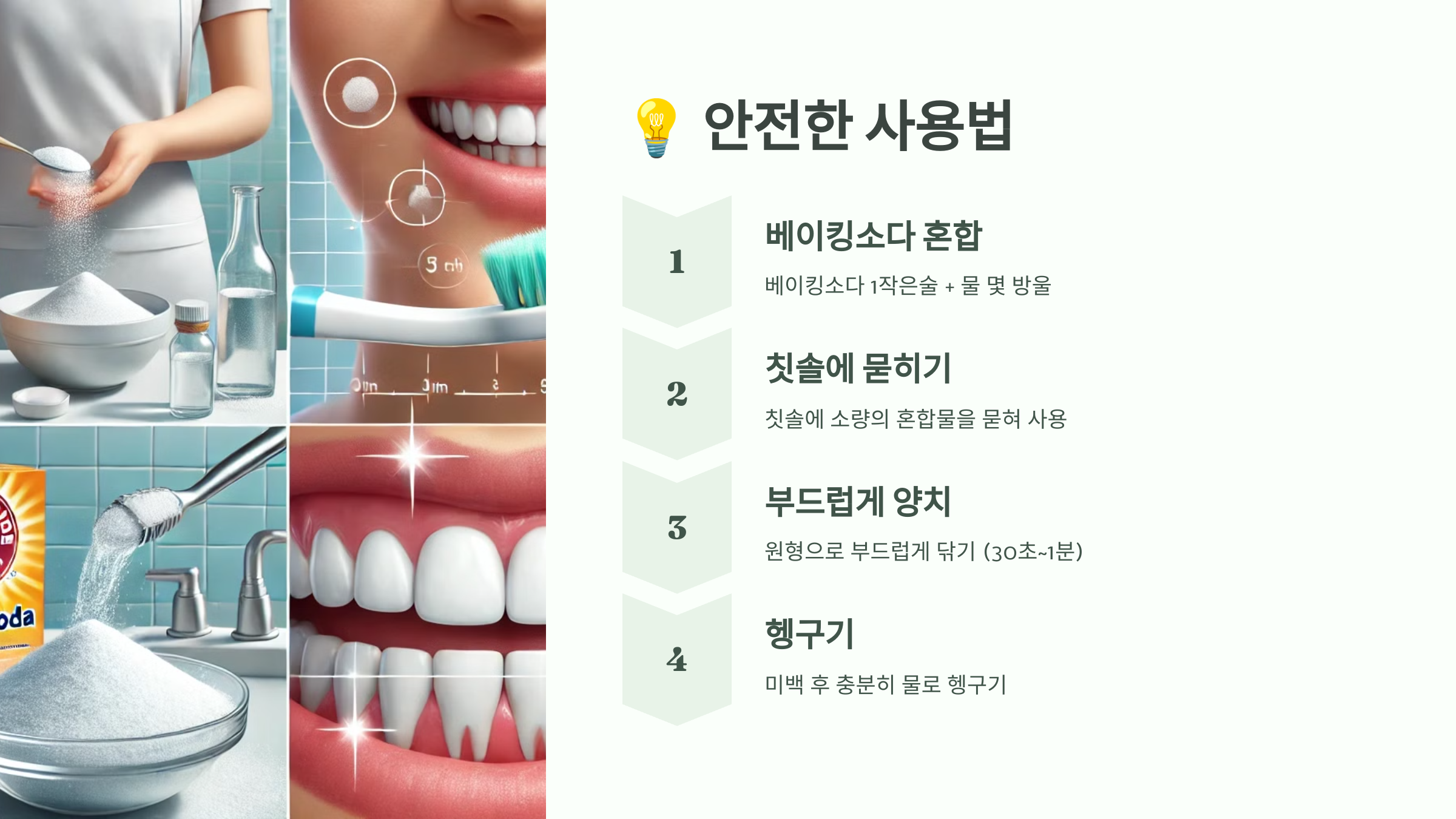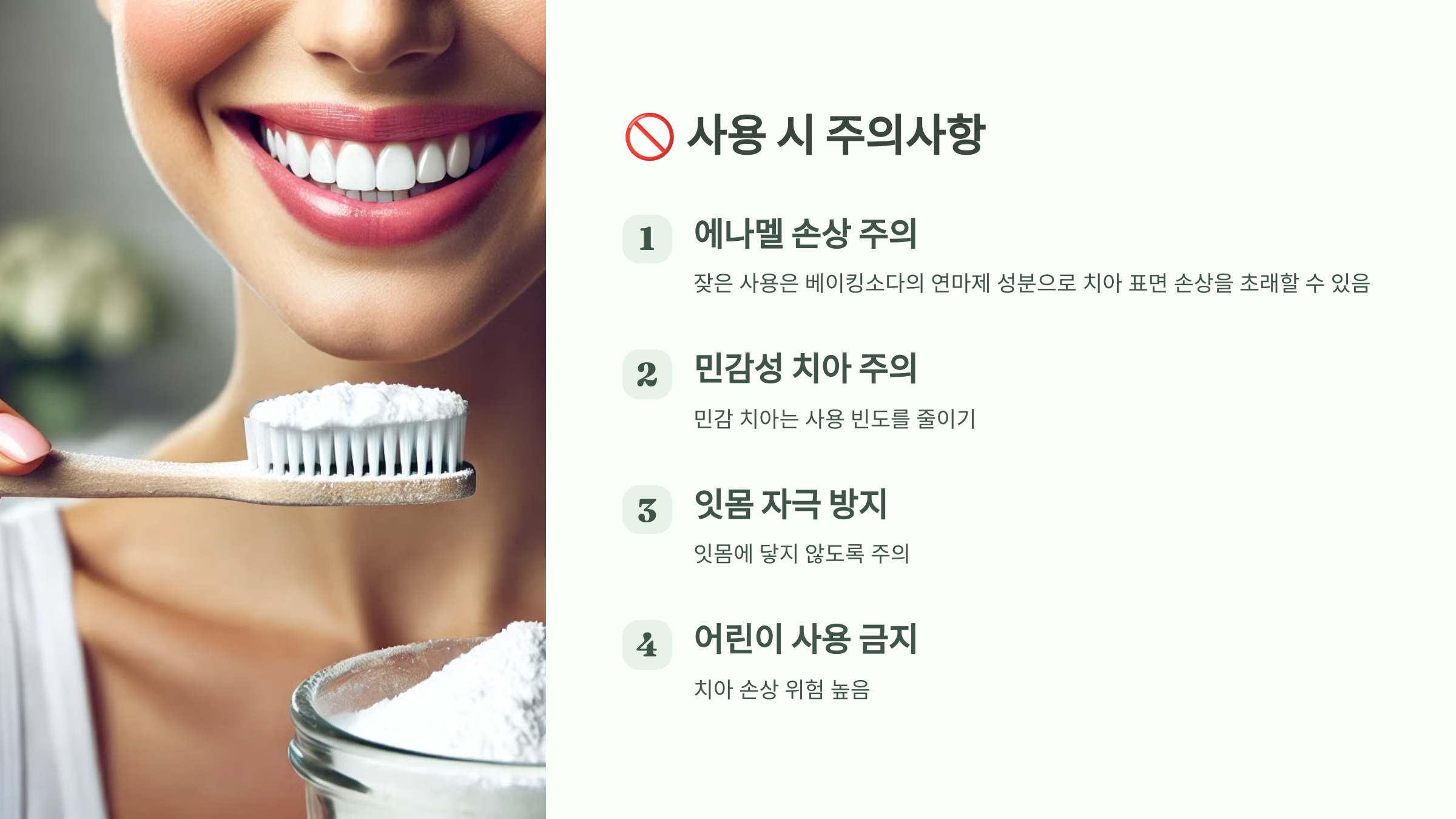 1️⃣ 에나멜 손상 주의: 베이킹소다는 연마제 성분이 있어 잦은 사용은 치아 표면 손상을 초래할 수 있습니다