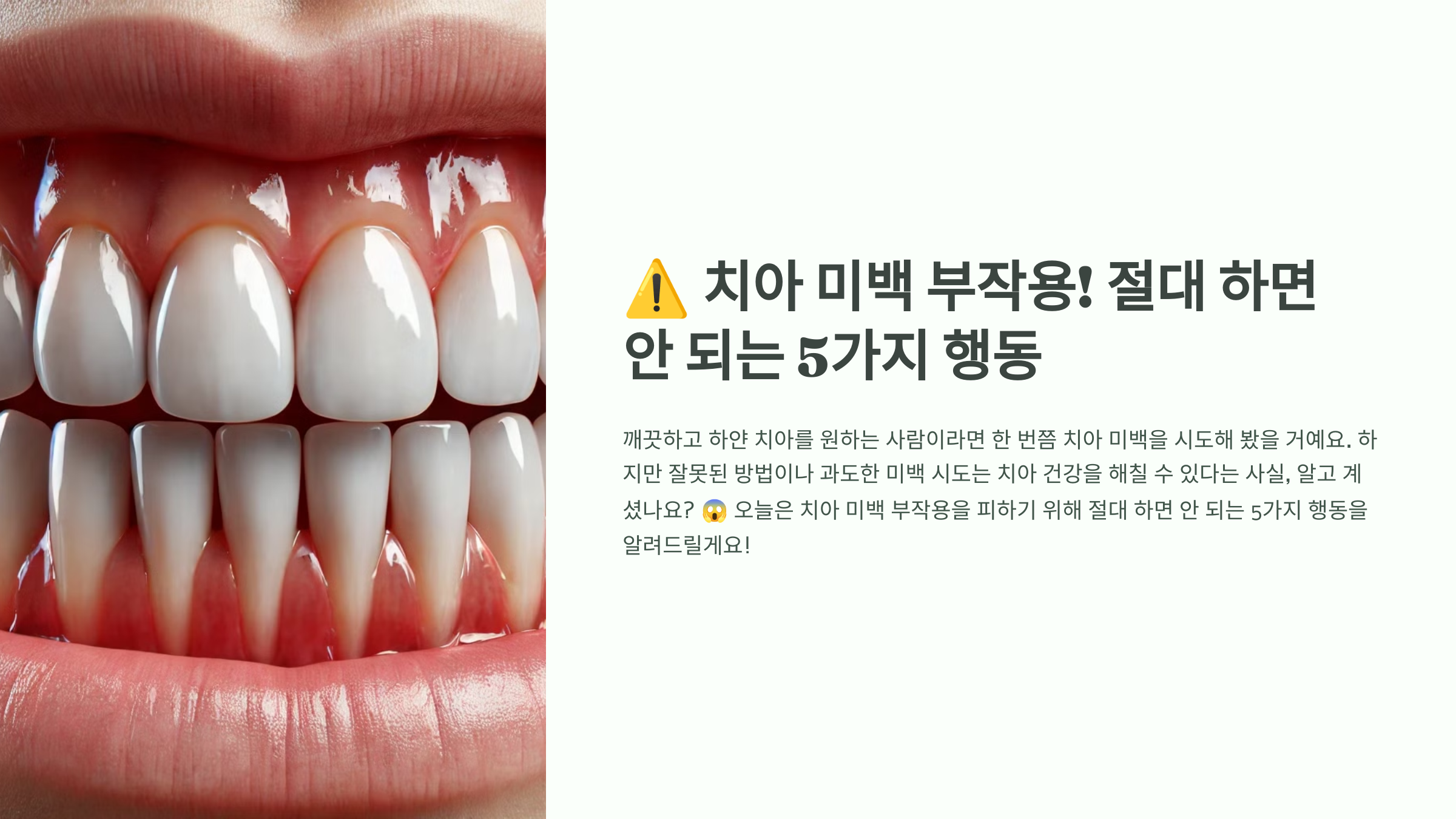 미백을 제대로 하지 않으면 치아가 더 민감해지고, 법랑질이 손상되며, 오히려 착색이 심해질 수도 있어요. 오늘은 치아 미백 부작용을 피하기 위해 절대 하면 안 되는 5가지 행동을 알려드릴게요!