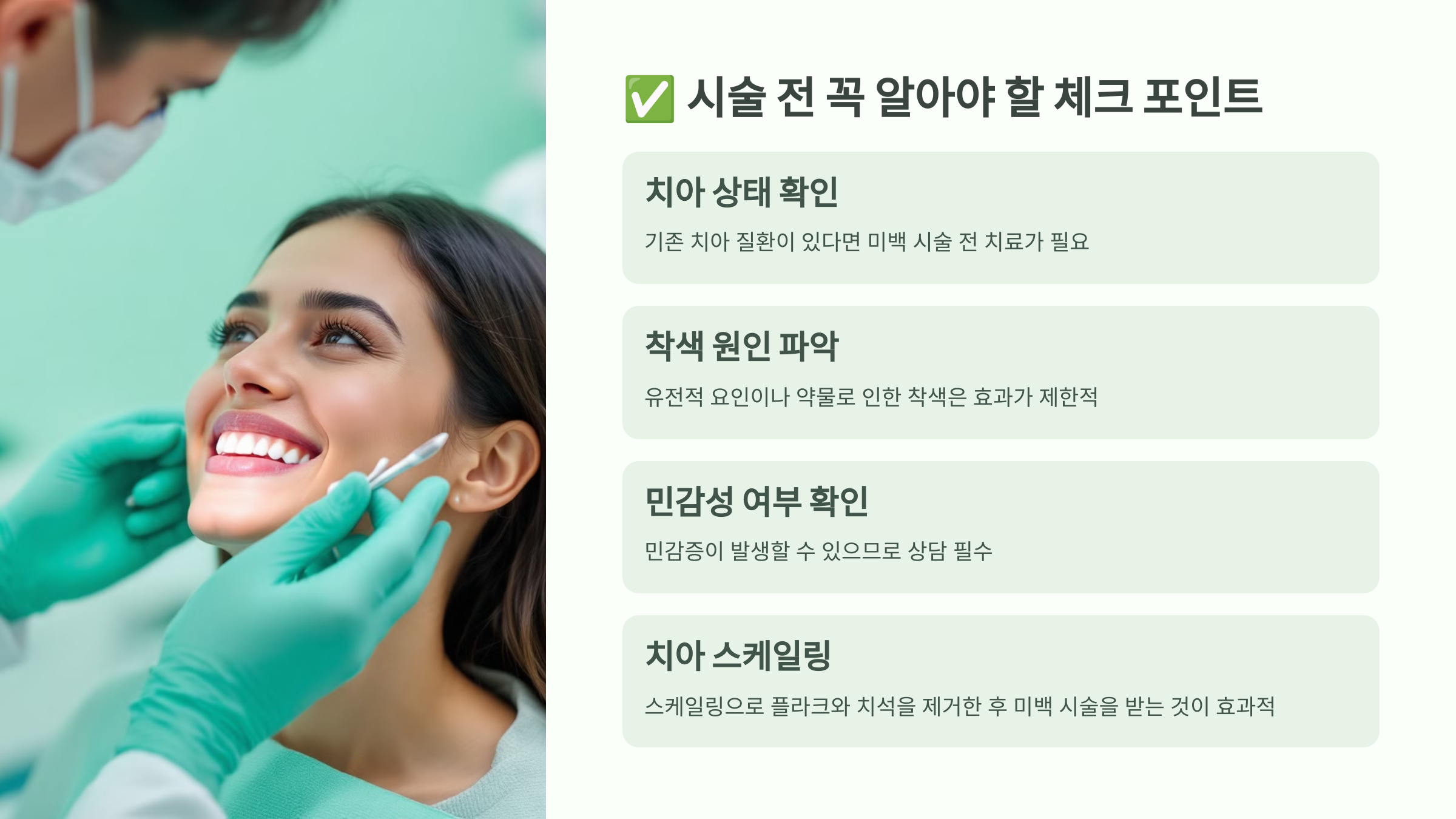- 기존 충치, 치아 균열, 잇몸 질환이 있다면 미백 시술 전에 치료가 필요합니다