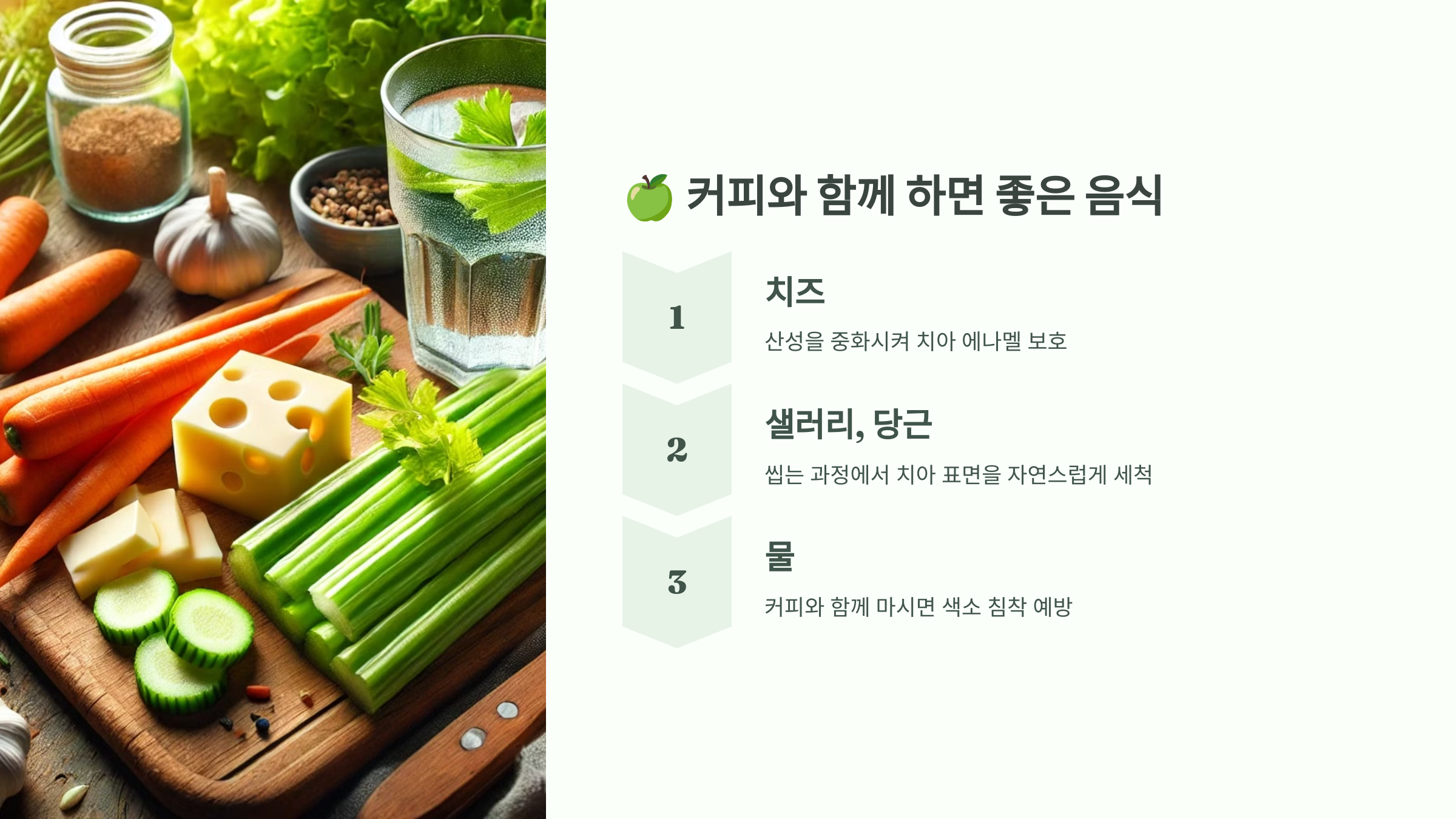 ✅ 씹는 음식 섭취: 생채소나 치즈는 치아 표면을 깨끗하게 유지해 줍니다